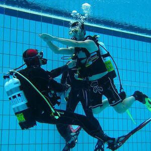 - Geschwindigkeitskontrolliertes Aufsteigen am Hauptatemregler des Tauchpartners aus der maximalen Tiefe (vom Tauchlehrer bestimmt) im freien Wasser bis auf 5 Meter mit deutlichem Stopp und dann langsam an die Wasseroberfläche.